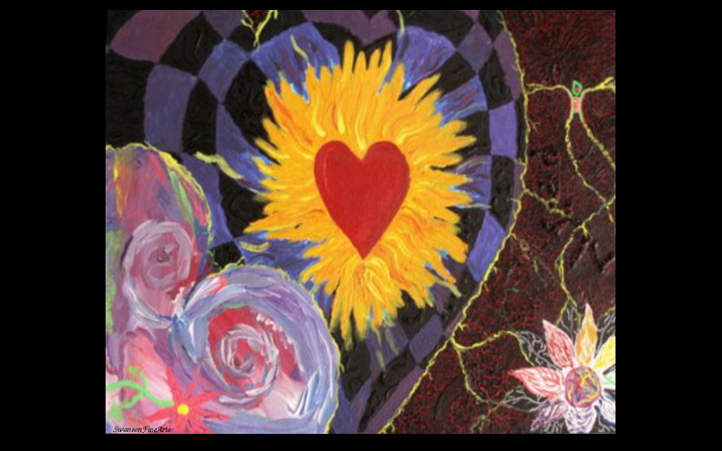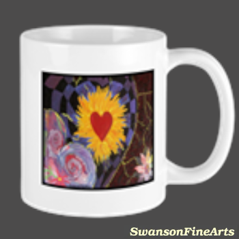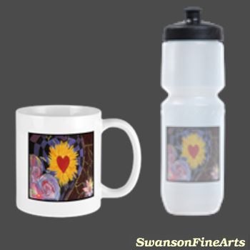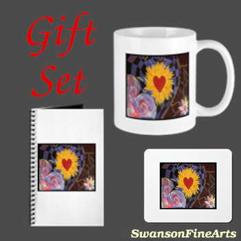 This coffee cup set comes with coffee cup, journal for reflective writing, and a mousepad to brighten your home office. Features our beautiful "Inner Heart" painting professionally printed on each item. Price includes all shipping and taxes. Thank you for shopping with SwansonFineArts.