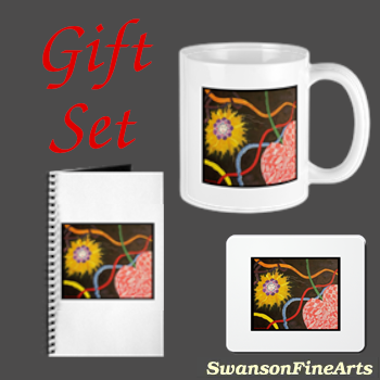 This gift set features a spiral notebook, 9.25"x7.75" mousepad, and 11oz ceramic coffee cup. All of them have our "Outer Heart" painting professionally printed, and there is no additional charge for shipping or taxes. We cover all the fees, and it is shipped directly to your home or office. Thank you for shopping with SwansonFineArts.