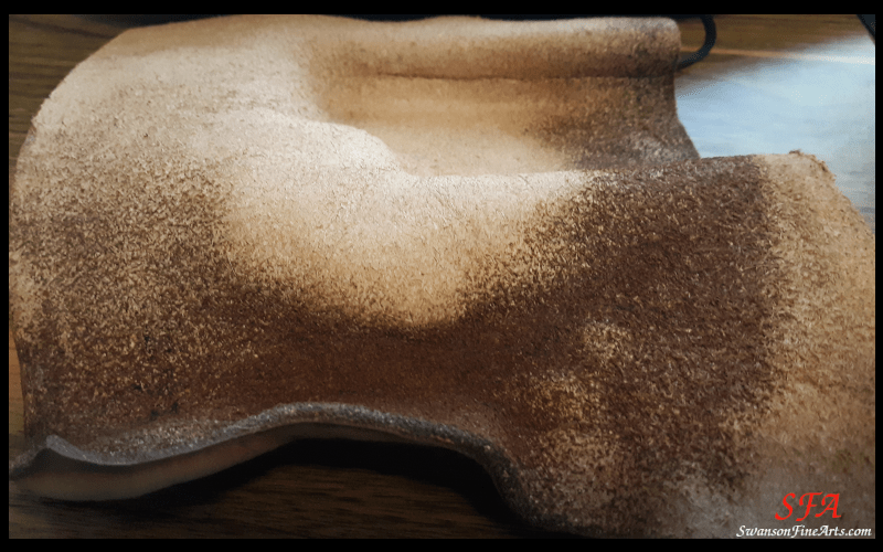 Once I cut the leather to make two rectangles, I used hot water to help me shape and form the leather. Be careful though, because I ended up boiling and damaging some of my leather which caused it to curl, bubble, and even turn dark and brittle in some places.
