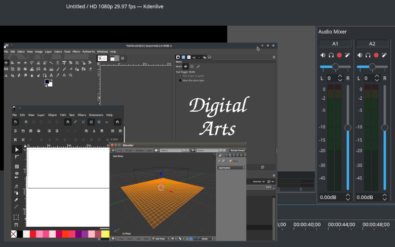 We are proud to support open-source software such as GIMP, Inkscape, Kdenlive, and Blender. Join us for digital arts tutorials and behind-the-scenes into creation of logos, digital drawings, and animations as we move forward. This section of our website will include the digital setup for embroidery, 3-D printing, animations, and image creation. Contact us to request digital arts or join us for discussions on arts and technology.